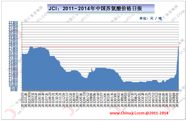 據(jù)JCI統(tǒng)計(jì)數(shù)據(jù)顯示,自8月下旬以來(lái),我國(guó)蘇氨酸市場(chǎng)價(jià)格大漲9500元/噸,上漲幅度為78.51%,截至本周初市場(chǎng)平均價(jià)格達(dá)到21600元/噸,部分地區(qū)市場(chǎng)偏高報(bào)價(jià)為22000-23000元/噸,短期價(jià)格以及上漲幅度均為近幾年的最高點(diǎn),詳見(jiàn)下圖所示。